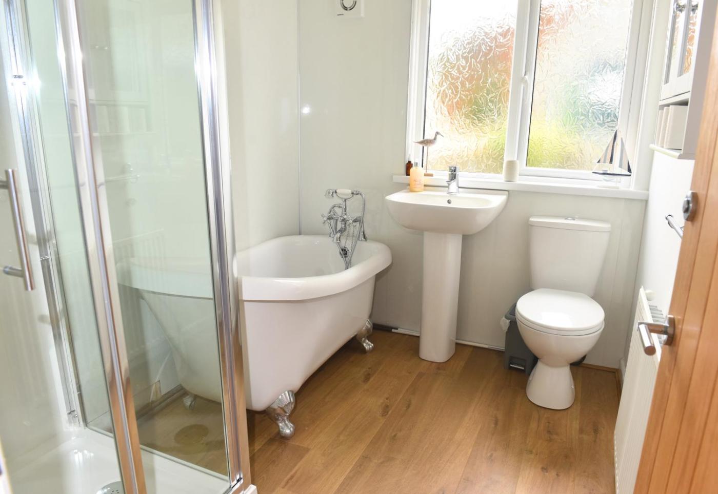 Two-Bedroom Cottage. Boasting a private entrance, this holiday home includes 1 living room, 2 separate bedrooms and 2 bathrooms with a walk-in shower and a bath. The fully equipped kitchen features a stovetop, a refrigerator, a dishwasher and kitchenware. This holiday home has a washing machine, flat-screen TV with streaming services, sea views, as well as chocolate for guests. The unit has 4 beds.