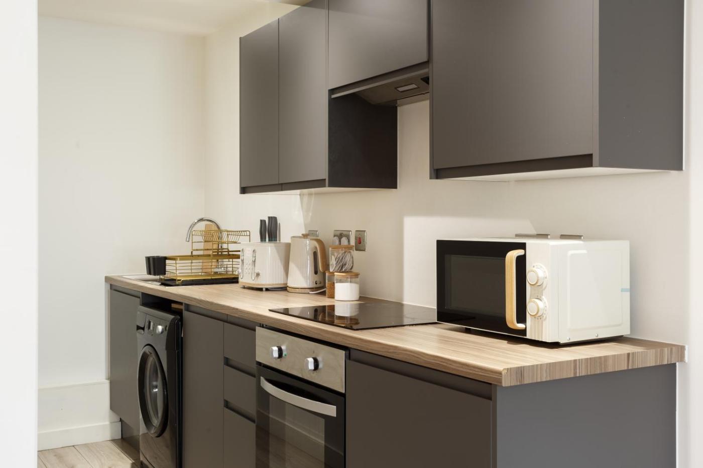 Two-Bedroom Apartment. This apartment features 1 living room, 2 separate bedrooms and 2 bathrooms with a bath and free toiletries. Guests can make meals in the kitchen that has a stovetop, a refrigerator, a dishwasher and kitchenware. A seating area with a flat-screen TV, a washing machine and a balcony are offered in this apartment. The unit has 2 beds.