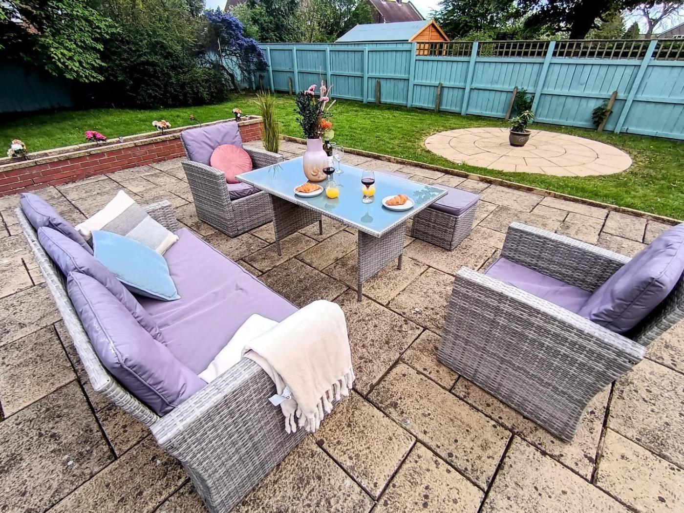 The holiday home features 3 bedrooms, 1 bathroom, bed linen, towels, a flat-screen TV with streaming services, a dining area, a fully equipped kitchen, and a terrace with garden views.