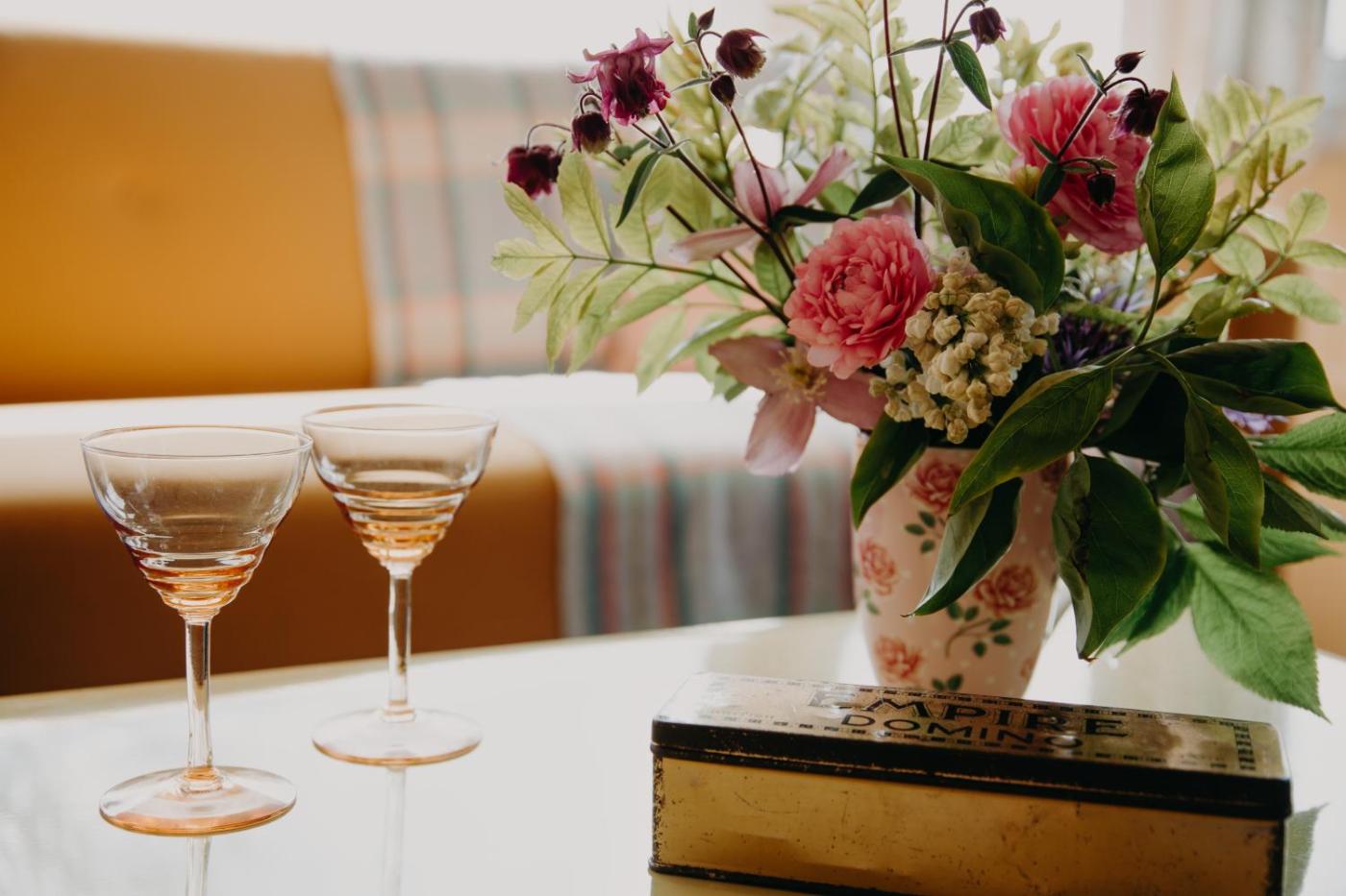 Holiday Home. This Glamavan is a retro static caravan and has a dining table, and 2 sofas in the living space. There is a fully fitted kitchen with an undercounter fridge with freezer, microwave, kettle, toaster, gas oven with eye level grill. There are 2 bedrooms, a double room and a twin room with narrow beds which are short and suitable for Children only. There is a single sofa bed. Please note, this is a caravan and has low ceilings. There is no Wi-Fi in the accommodation, but you may use the Wi-Fi on the farm. Heating is via plug in oil filled radiators.