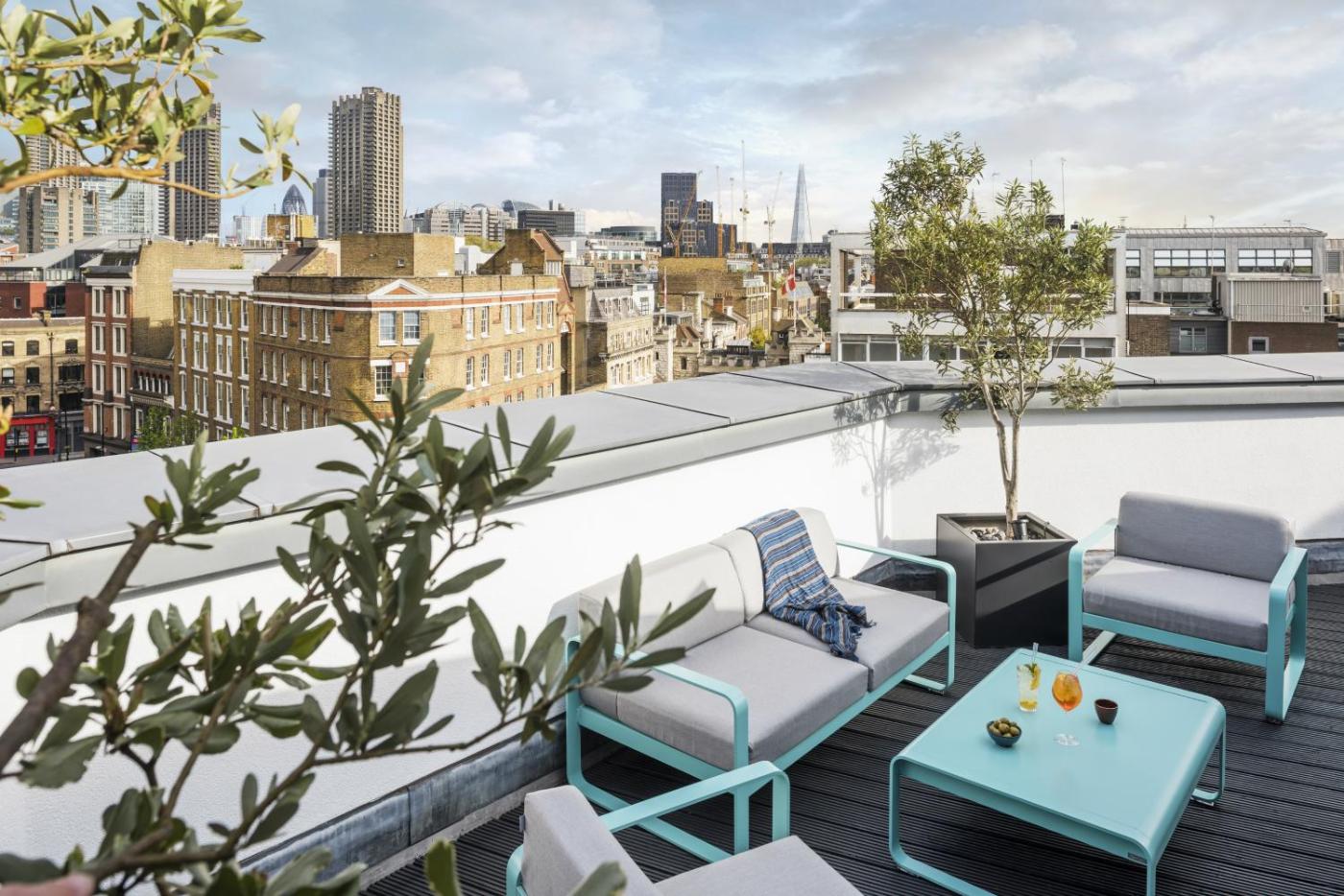 Rooftop Queen. Drift offthe soft bed while you take in the views across London through the floor to ceiling windows – the perfect escape for a quiet getaway. The spacious Rooftops feature soft colours and geometric details with re-imagined furniture, fabrics and finishes taking inspiration from the warehouse heritage. ;