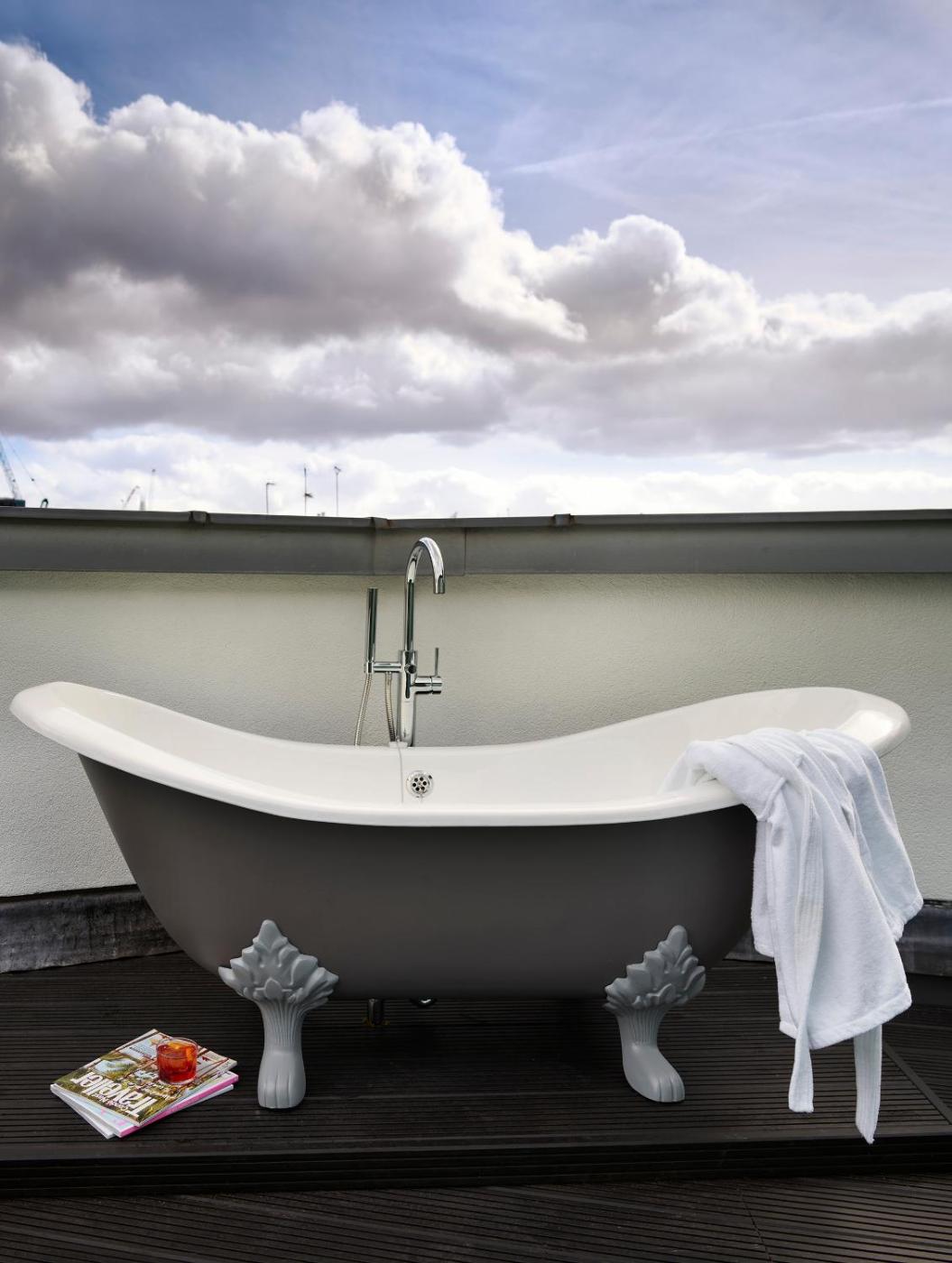 Rooftop Signature. Spacious top floor room featuring a large king size bed and spacious floor plan, equipped with a lounge area, workspace, sound system. Bifold doors lead onto an expansive terrace with an outdoor seating area and al fresco working bath tub overlooking panoramic city views. Please be aware that for a unique and refreshing experience, the stunning bathtub on your balcony provides only cold water. While it may not offer the traditional hot bath option, its perfect for enjoying the cool evening air or taking an invigorating morning plunge with breathtaking views. ;