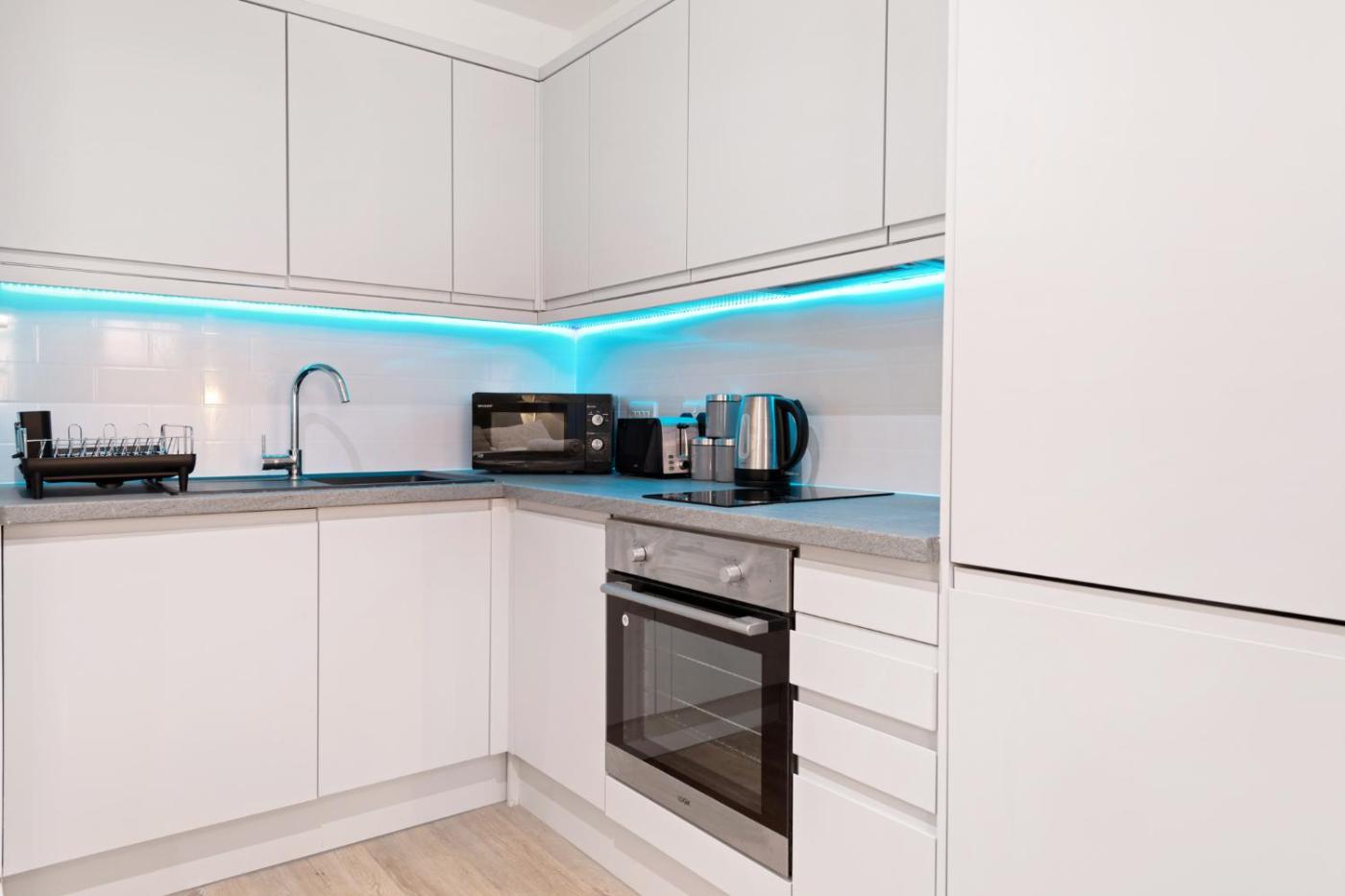 One-Bedroom Apartment. The well-fitted kitchen features a refrigerator, an oven and a microwave. The apartment provides a washing machine, tumble dryer, a sofa, parquet floors and a flat-screen TV. The unit offers 1 bed.