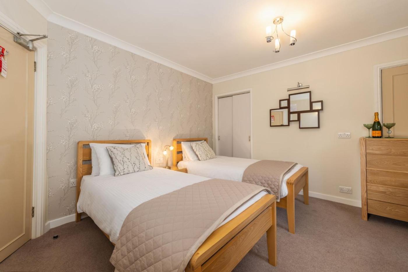 Ground Floor Twin Room. This is a ground floor room with en-suite step in shower. It is accessible via a flight of stairs to the lower ground floor but is also accessible via the carpark from the rear of the property by using a key coded door. The dining room is also situated on this floor and is ideal for guests who prefer not to use stairs. The bedroom window faces the rear of the property. ;